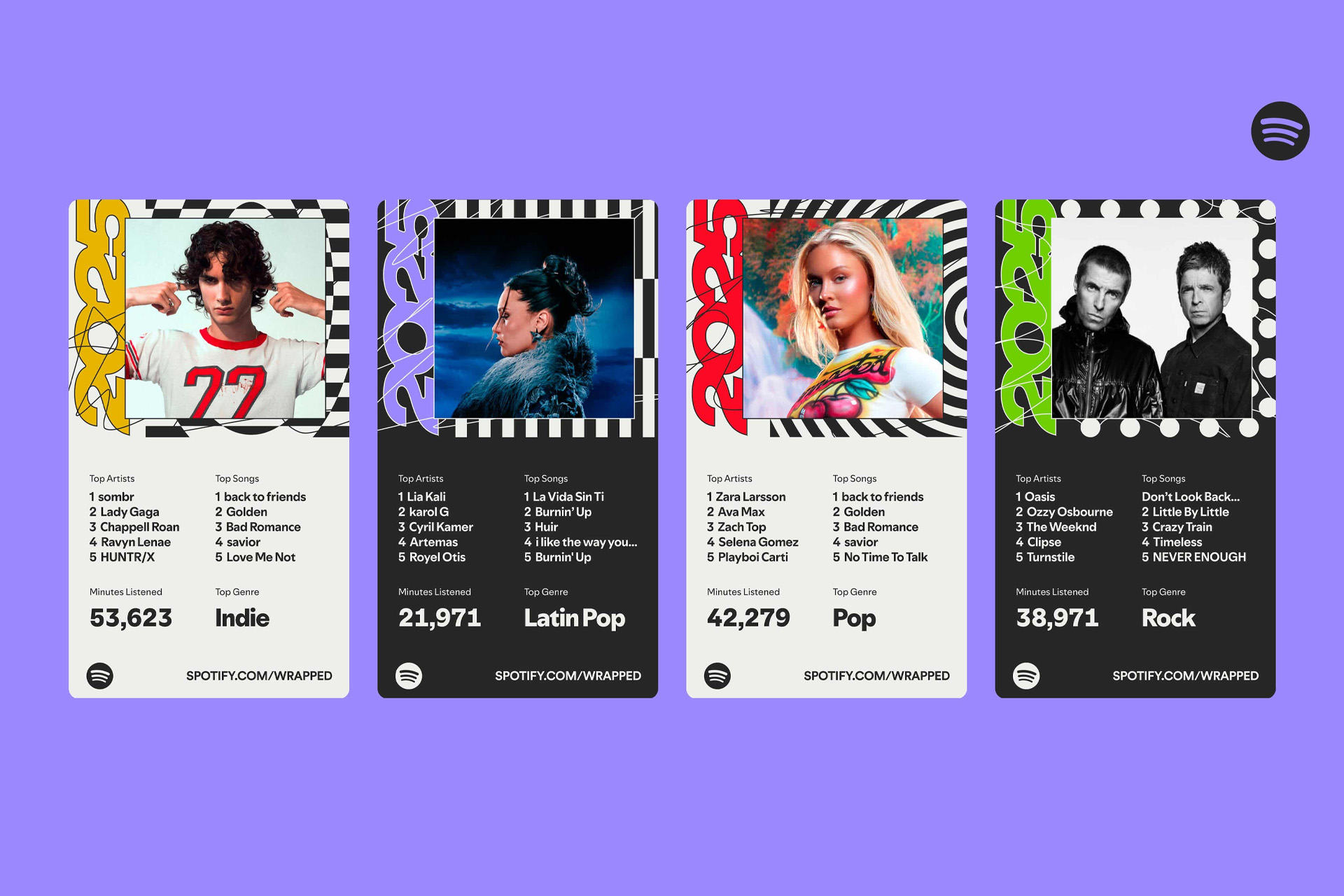 Spotify Royalties 2025 - Four Spotify Wrapped-style cards displaying top artists, top songs, minutes listened, and favorite genres on a purple background.