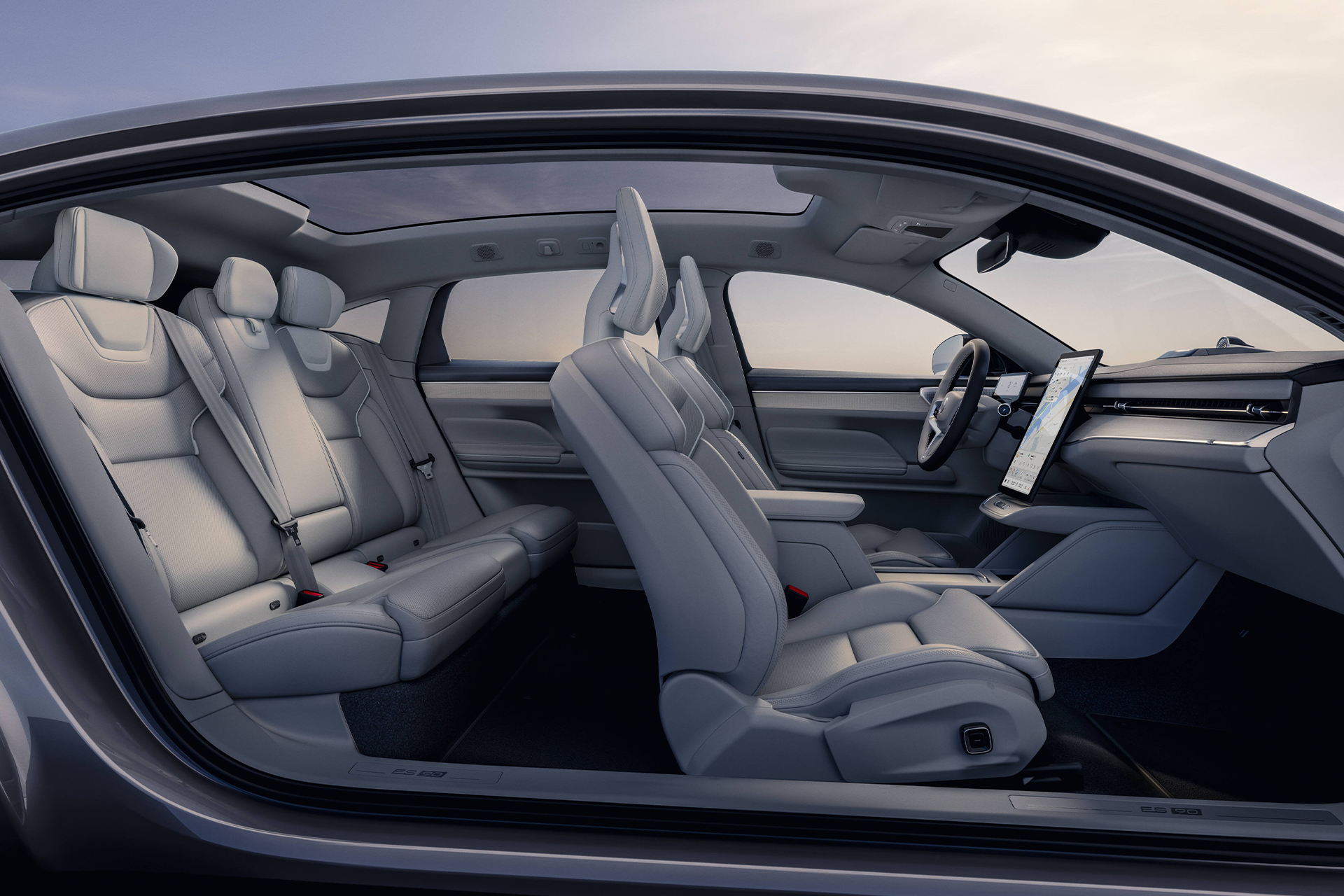 True to Volvo’s Scandinavian identity, the ES90’s cabin embraces minimalism and tactile comfort. Natural materials such as wool blends, open-pore wood, and recycled composites define a calm, light-filled interior atmosphere. The design avoids excess, favoring clean geometry and intuitive functionality.